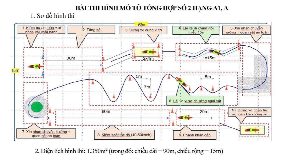 - Sa hình xe máy được chia thành hai phần: Bài hình tổng hợp số 1 và Bài hình tổng hợp số 2. Thí sinh phải vượt qua từng phần theo đúng thứ tự.