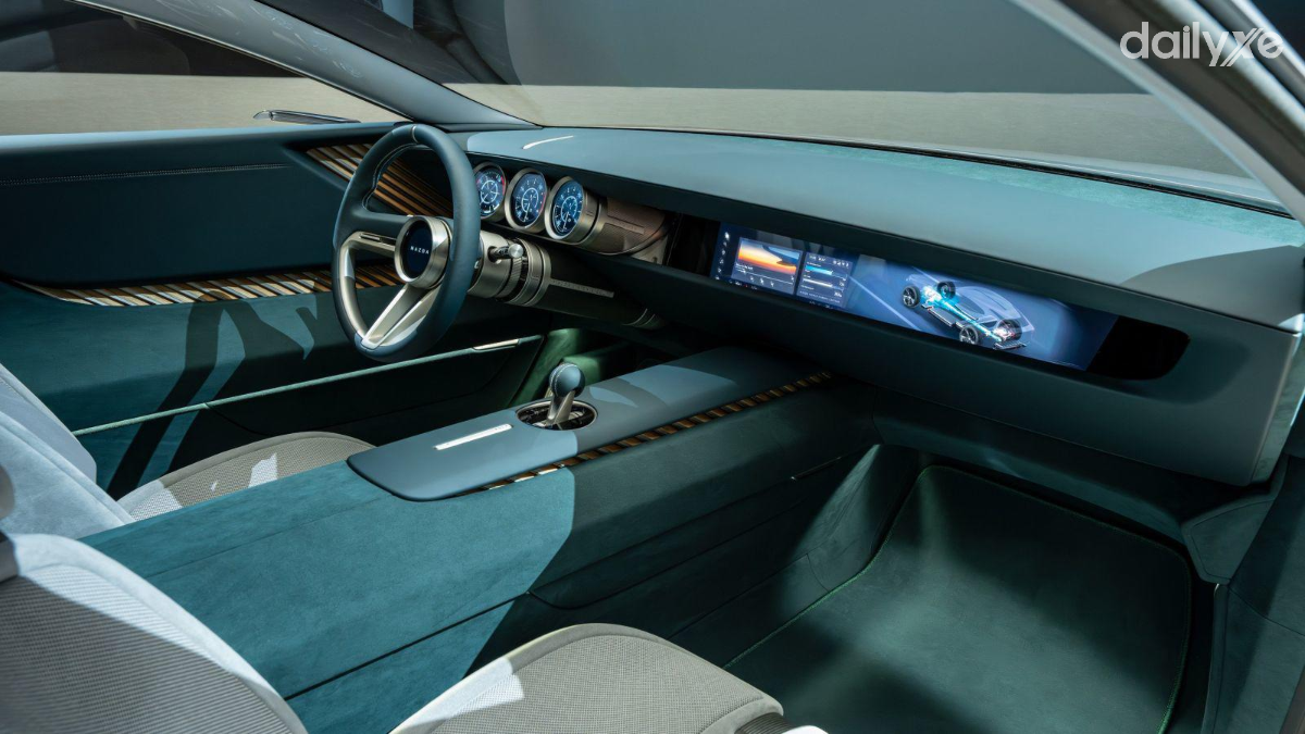Bên trong, nội thất Vision X-Coupé được hoàn thiện theo phong cách tối giản và sang trọng, sử dụng vật liệu da hai tông màu xám – xanh lá cây. Xe có cấu hình 4 ghế độc lập dạng bucket, mang lại cảm giác thể thao và cao cấp. Trung tâm bảng điều khiển là màn hình giải trí cỡ lớn kéo dài sang phía hành khách, kết hợp bảng đồng hồ kỹ thuật số và vô lăng ba chấu cổ điển. Bệ trung tâm cao ôm trọn khu vực người lái, cùng núm chuyển số hình quả bóng tạo điểm nhấn độc đáo.
