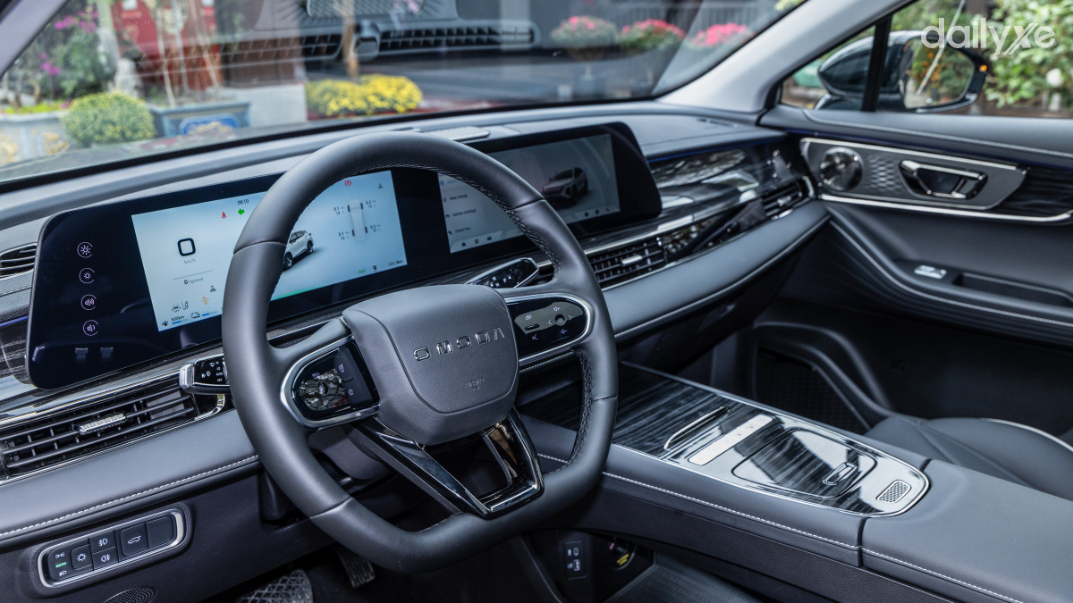 Không gian nội thất nổi bật với cụm màn hình cong gồm màn hình giải trí và bảng đồng hồ kỹ thuật số. Vô-lăng đáy phẳng phong cách thể thao, ghế bọc da cao cấp, ghế lái chỉnh điện. Các tiện ích quen thuộc như điều hòa tự động, cửa gió hàng ghế sau, cửa sổ trời, sạc không dây và cốp điện đều xuất hiện.