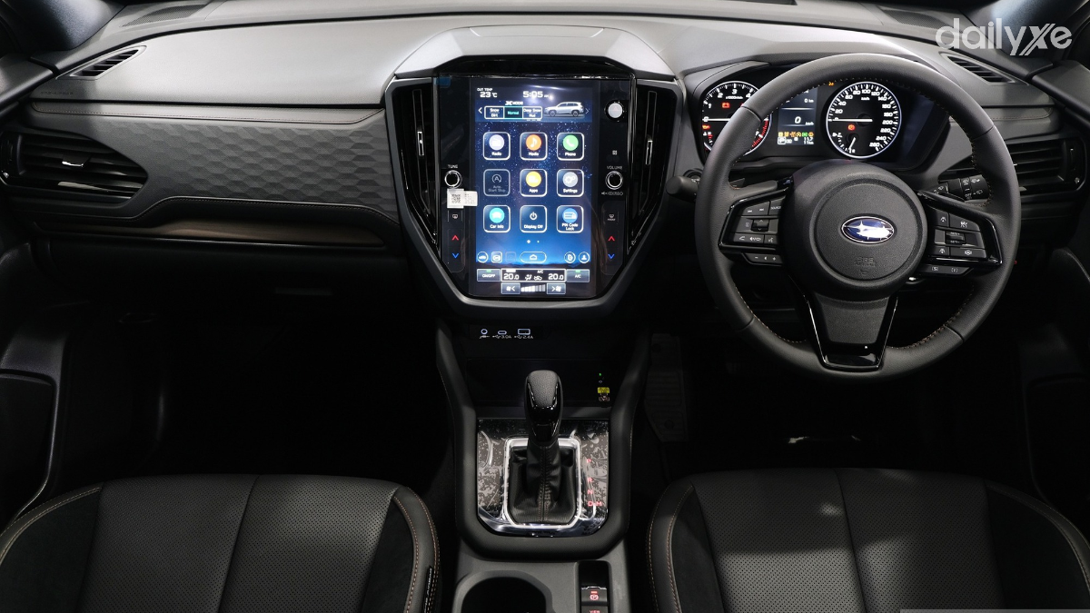 Bên trong, khoang nội thất của Forester mới vẫn giữ phong cách thiết kế đơn giản, thực dụng, nhưng được nâng cấp đáng kể về chất lượng và trải nghiệm người dùng. Xe sử dụng ghế bọc da kết hợp chất liệu Ultra-Suede tông đen, ghế lái chỉnh điện 10 hướng có nhớ vị trí, ghế phụ chỉnh điện 8 hướng. Trung tâm bảng táp-lô là màn hình cảm ứng 11,6 inch đặt dọc, hỗ trợ Apple CarPlay và Android Auto không dây, sạc không dây 10W, điều hòa tự động hai vùng độc lập và cửa gió cho hàng ghế sau.