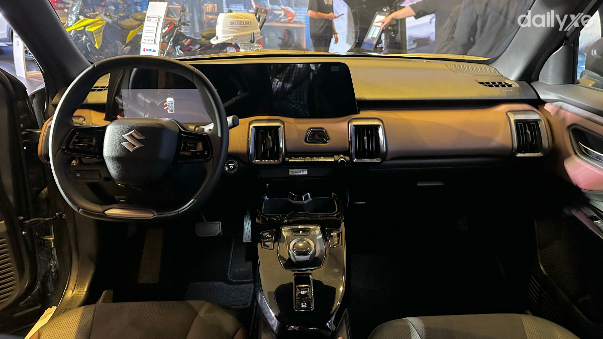 Không gian nội thất của e Vitara cho thấy sự thay đổi rõ rệt so với các dòng xe truyền thống của Suzuki. Vô-lăng hai chấu vát phẳng, cụm đồng hồ và màn hình giải trí nối liền trên táp-lô, cùng cần số điện tử dạng núm xoay tạo cảm giác hiện đại và tối giản.