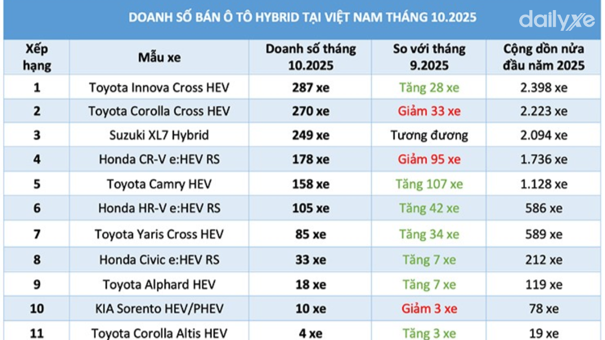 Ở từng mẫu cụ thể, Toyota Innova Cross HEV dẫn đầu tháng 10 với 287 xe, tiếp theo là Corolla Cross HEV và Suzuki XL7 Hybrid. Lũy kế 10 tháng đầu năm 2025, doanh số hybrid toàn thị trường đạt 11.182 xe, tăng 4.110 xe (36,7%) so với cùng kỳ năm ngoái.