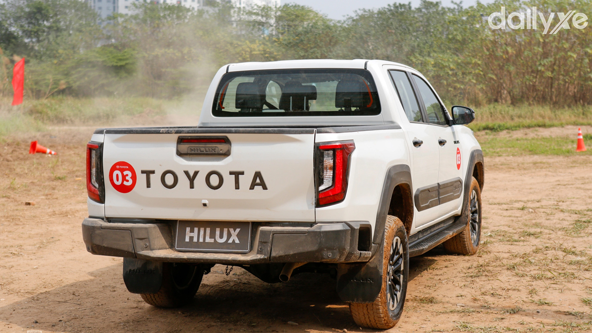 Dù vẫn giữ kính chắn gió, cột và cửa xe từ thế hệ ra mắt năm 2015, Hilux mới được làm lại chắn bùn trước và sau, vòm bánh xe vuông vức hơn, đi kèm thiết kế vành mới. Phía sau xe nổi bật với đèn hậu LED sắc nét và cản sau tích hợp bậc lên xuống hai bên, tăng tính tiện dụng.