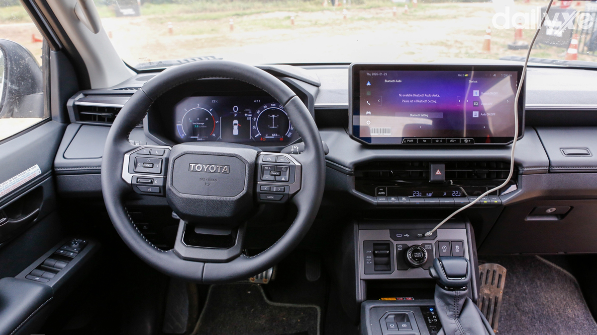 Khoang nội thất được đại tu toàn diện, với bảng điều khiển dạng khối hộp, màn hình giải trí 12,3 inch, cụm đồng hồ kỹ thuật số 12,3 inch và vô-lăng mượn thiết kế từ Land Cruiser. Các nút bấm vật lý cho điều hòa và âm thanh vẫn được giữ lại, phù hợp với tính chất xe bán tải.