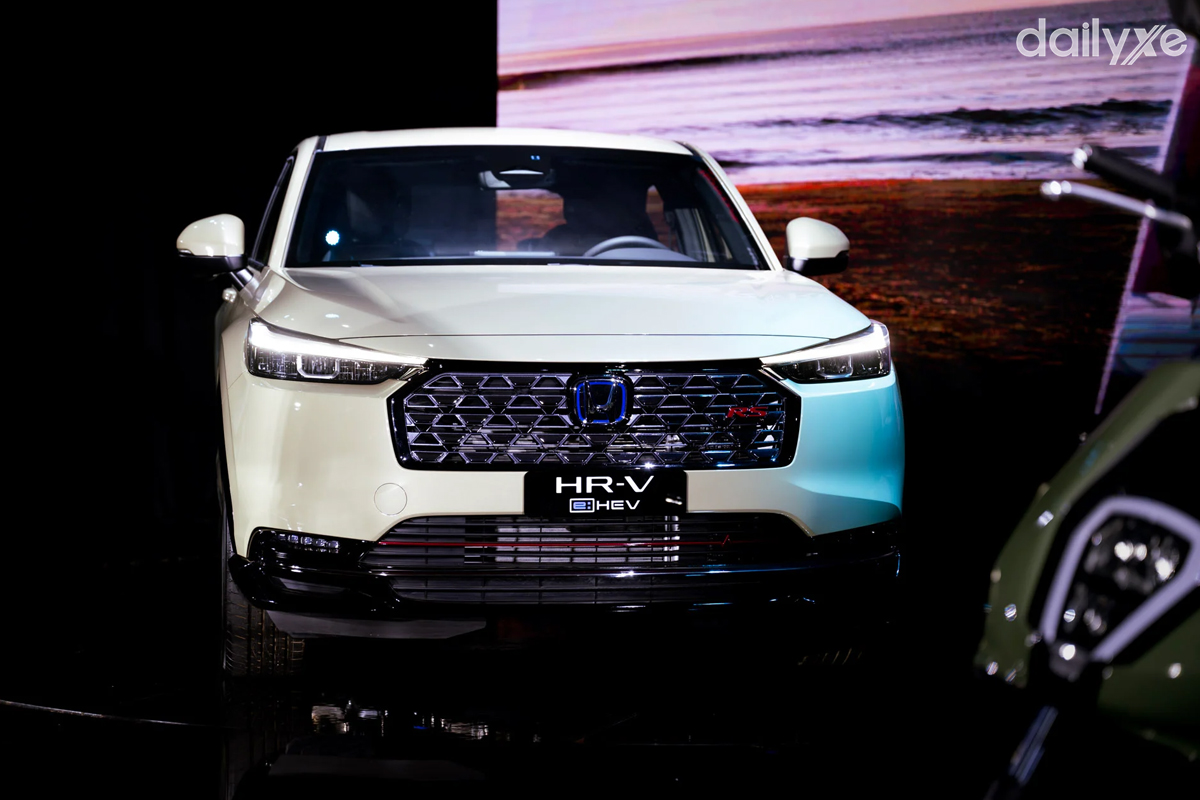 Lưới tản nhiệt trên HR-V e:HEV RS được thiết kế vuông vắn và cầu kỳ hơn với lớp phủ đen bóng kết hợp họa tiết ma trận mạ crôm, khác biệt rõ rệt so với kiểu thanh ngang đơn giản đồng màu thân xe ở các phiên bản thường.