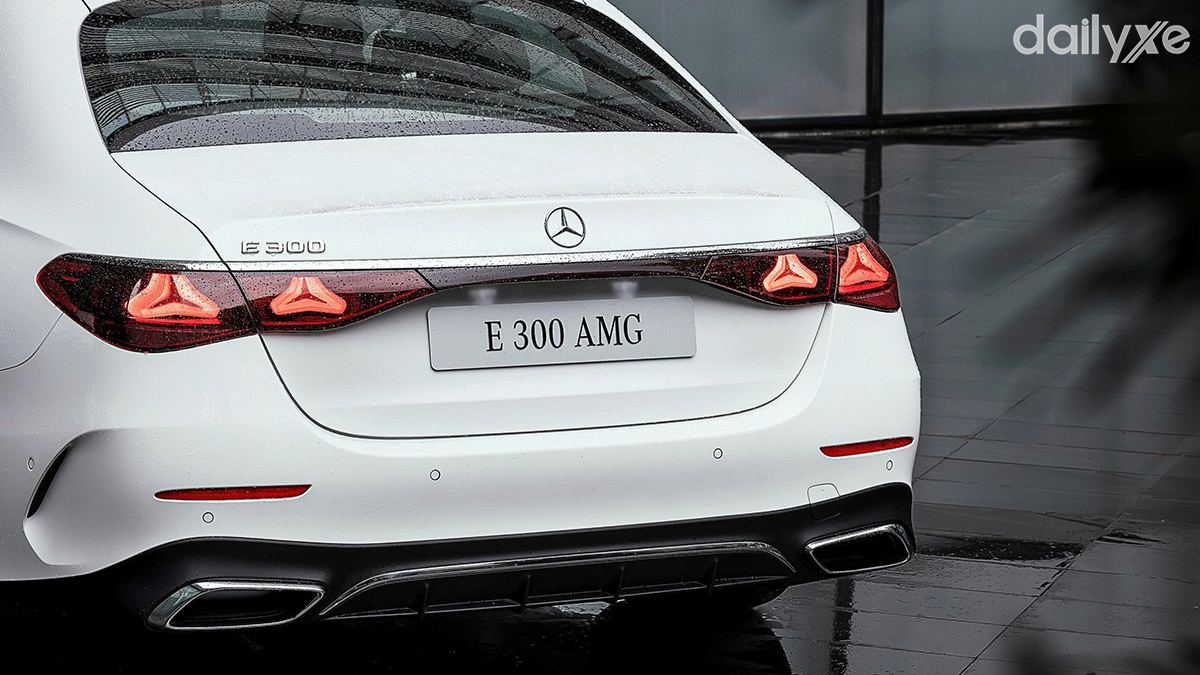 Đuôi xe Mercedes E-Class giữ vững phong thái của một mẫu xe Đức sang trọng mang đến ấn tượng riêng biệt. Dòng xe sử dụng cụm đèn hậu chia đôi tăng sự phóng khoáng mạnh mẽ nhưng không kém nét thanh lịch vốn có của dòng xe. Đồ hoạ LED sắc sảo cùng tạo hình thanh mảnh kéo dài đến tận nắp cốp tương tự phong cách của đàn anh S-Class.