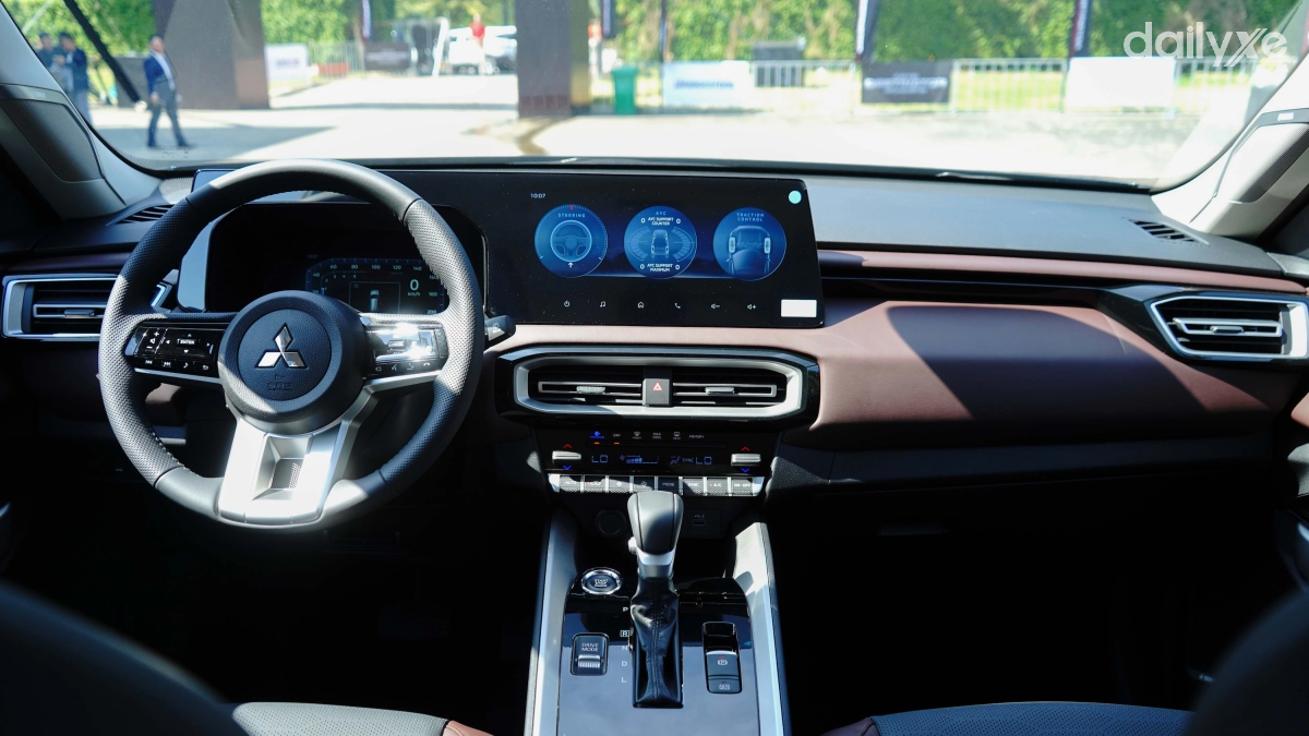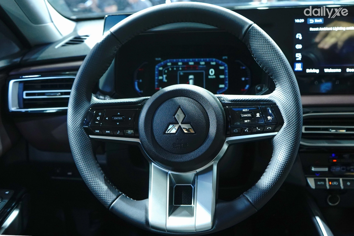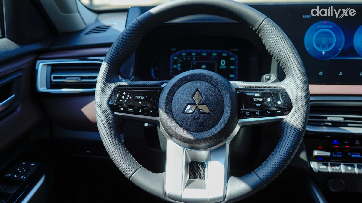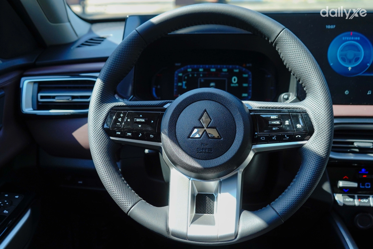 Vô lăng 3 chấu bọc da màu đen, nổi bật với logo Mitsubishi ở vị trí trung tâm, tích hợp nhiều phím chức năng giúp người lái thao tác thuận tiện và an toàn hơn khi di chuyển.
