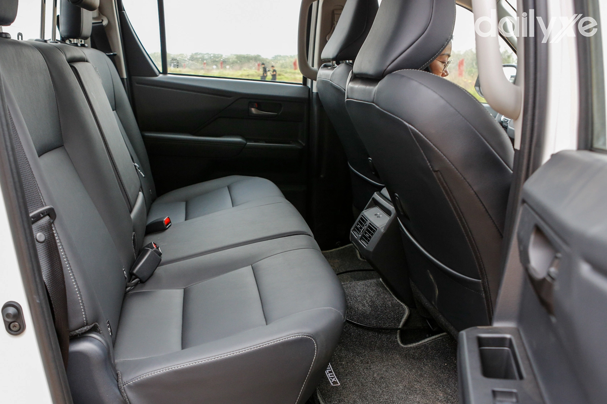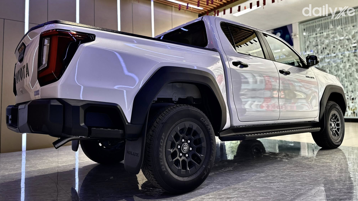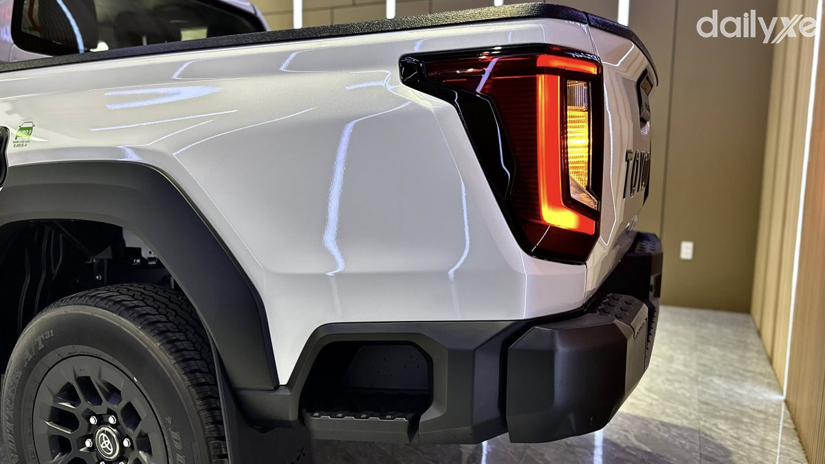 Cản sau được làm mới với bậc lên xuống hạ thấp, hỗ trợ thao tác lên xuống khoang chở hàng thuận tiện hơn. Các chi tiết như ốp cản sau, tay nắm cửa thùng và viền thùng xe đều sơn tối màu, tạo sự đồng nhất với thiết kế tổng thể.