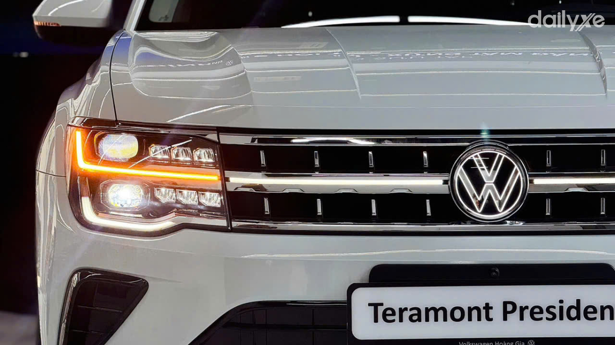 Nhìn từ phía trước, Volkswagen Teramont President mang đậm dấu ấn của thiết kế xe Đức có thiết kế tựa người anh em cùng nhà Volkswagen Tiguan. Những đường gân nổi trên nắp ca-pô giúp tổng thể thêm phần chắc chắn, mạnh mẽ. Mặt ca-lăng lớn với ba thanh ngang mạ chrome sáng bóng và logo VW chính giữa vừa tạo điểm nhấn, vừa tăng vẻ sang trọng.